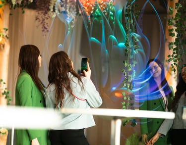 One of the attractions of the event was a mirror screen that covered one of the walls of the lobby. An animation of the AI generated flowers was played on loop for the duration of the event. The illusion of another dimension beyond the mirror immersed participants in the world of AI.