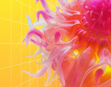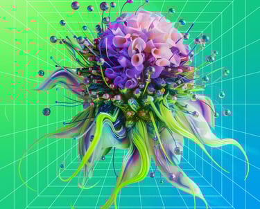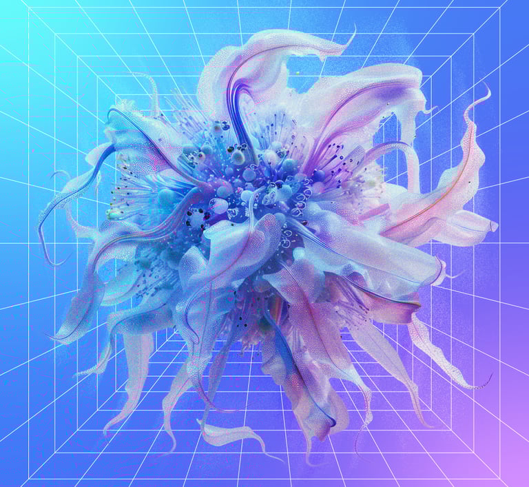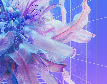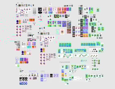 The flowers were then edited and adapted to be used as design assets. Finally, after exploring multiple visual paths, the visual identity came together, when the AI generated assets were combined with a bold typeface, vibrant gradient colour palette and geometric graphic elements to make the identity refined, cohesive and scalable.