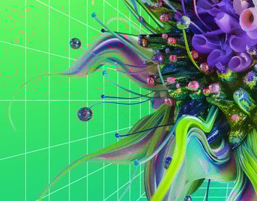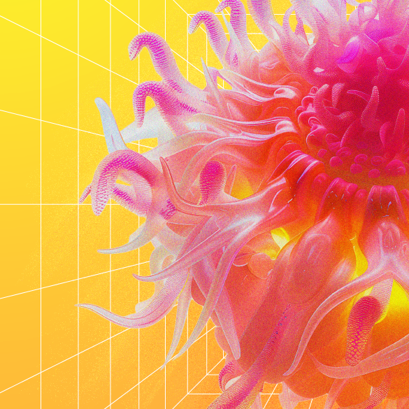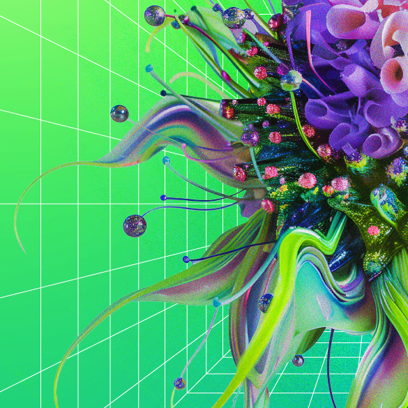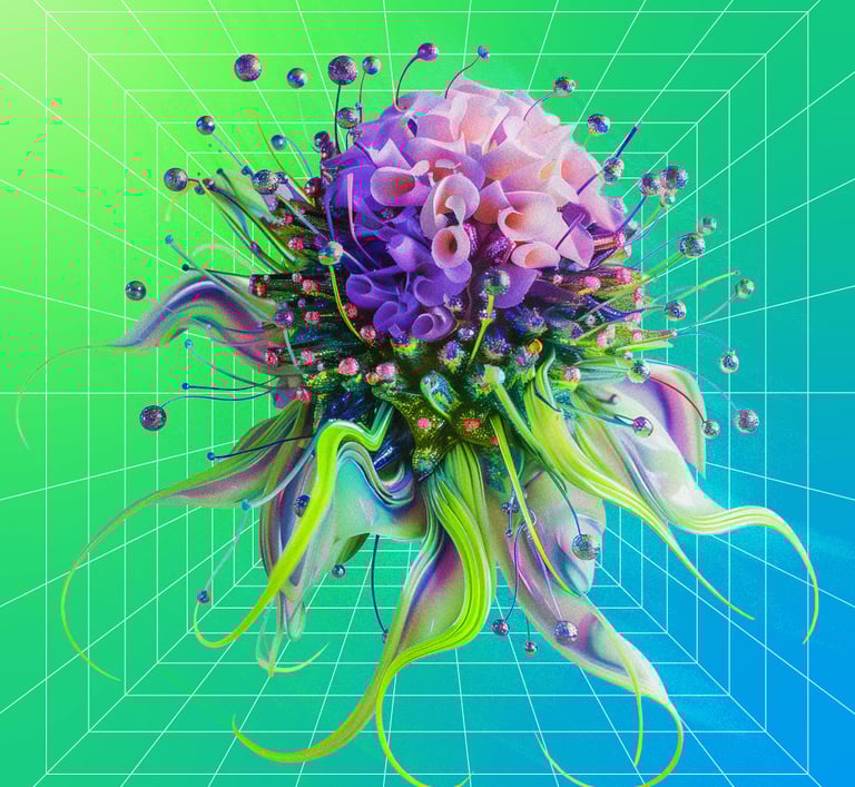 The elements for the visuals were produced with generative AI programs like Midjourney. The process included many prompts, building on AI mistakes and deviations to find something that felt just right. This approach resulted in futuristic and other-worldly images, with sci-fi alien flower creatures taking the main role.