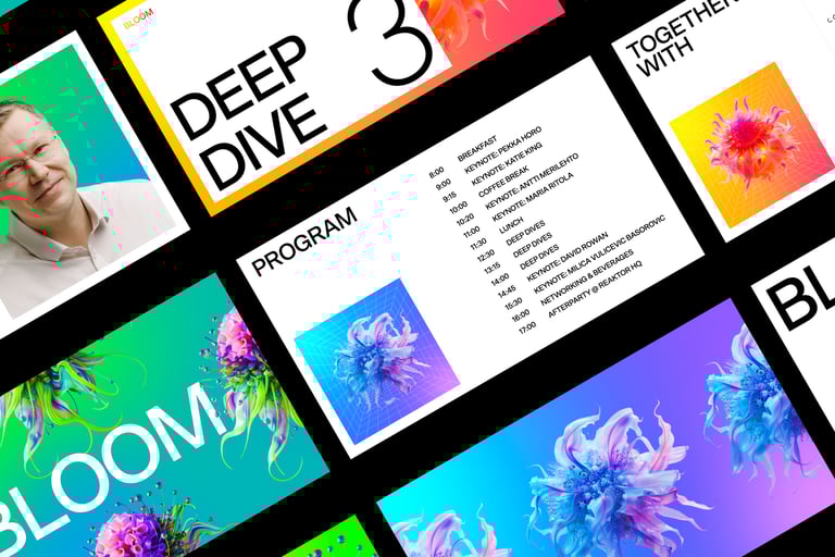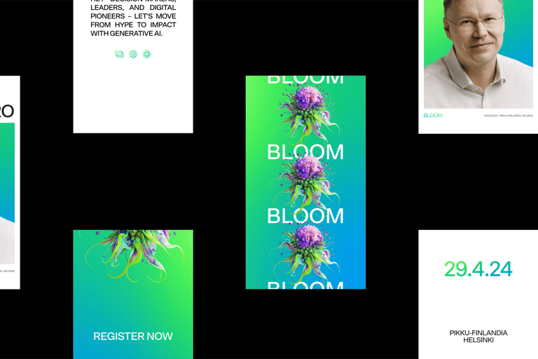 The challenge was to create a convincing visual identity for BLOOM that would express technological leadership, felt contemporary, and stood out from other tech events. The identity also needed to be scalable across different physical and digital implementations.