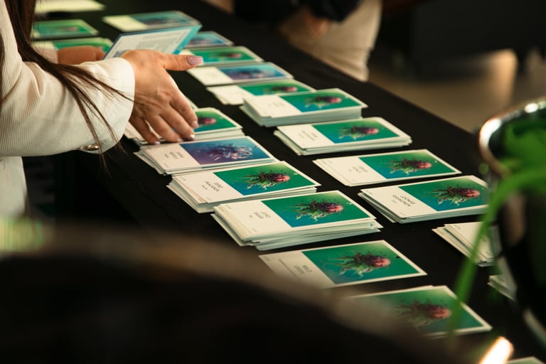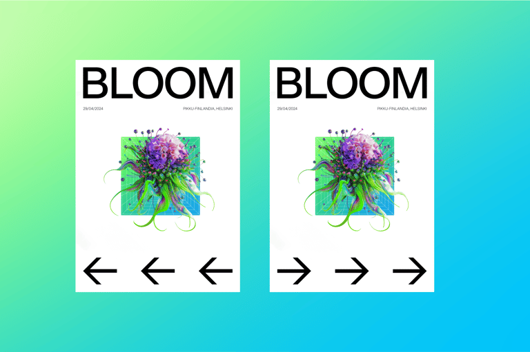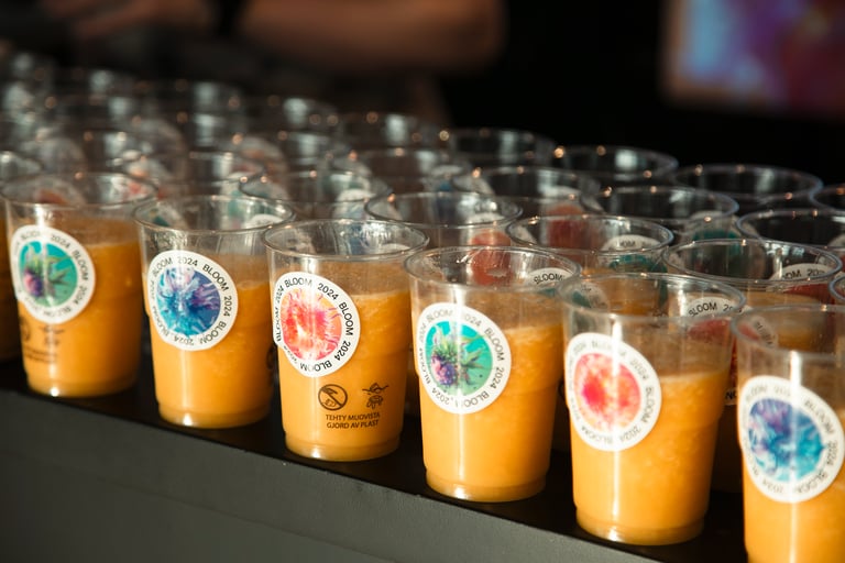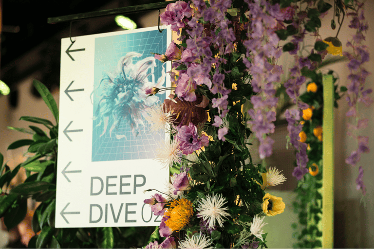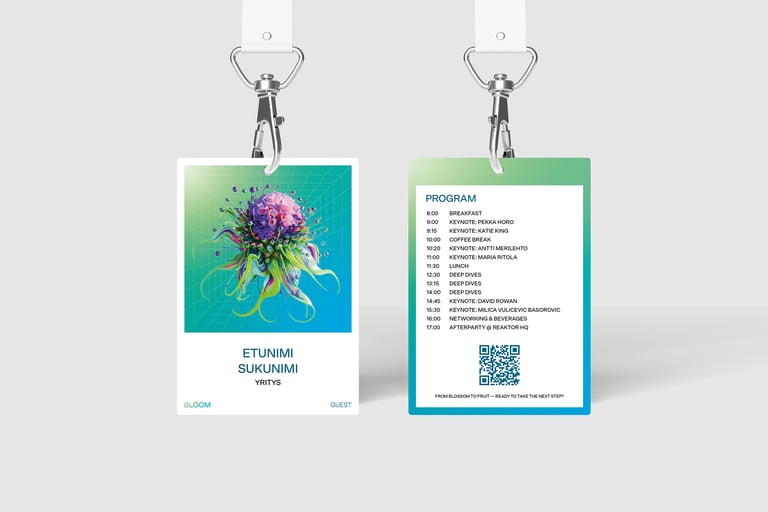 The whole look of the event came together when the visual identity was applied across multiple environments, such as info screens, various print materials, social media assets, streaming platform and presentation materials. The AI flowers influenced the decorations of the event space, the outfits of the hosts and flavours of smoothies catered at the event.